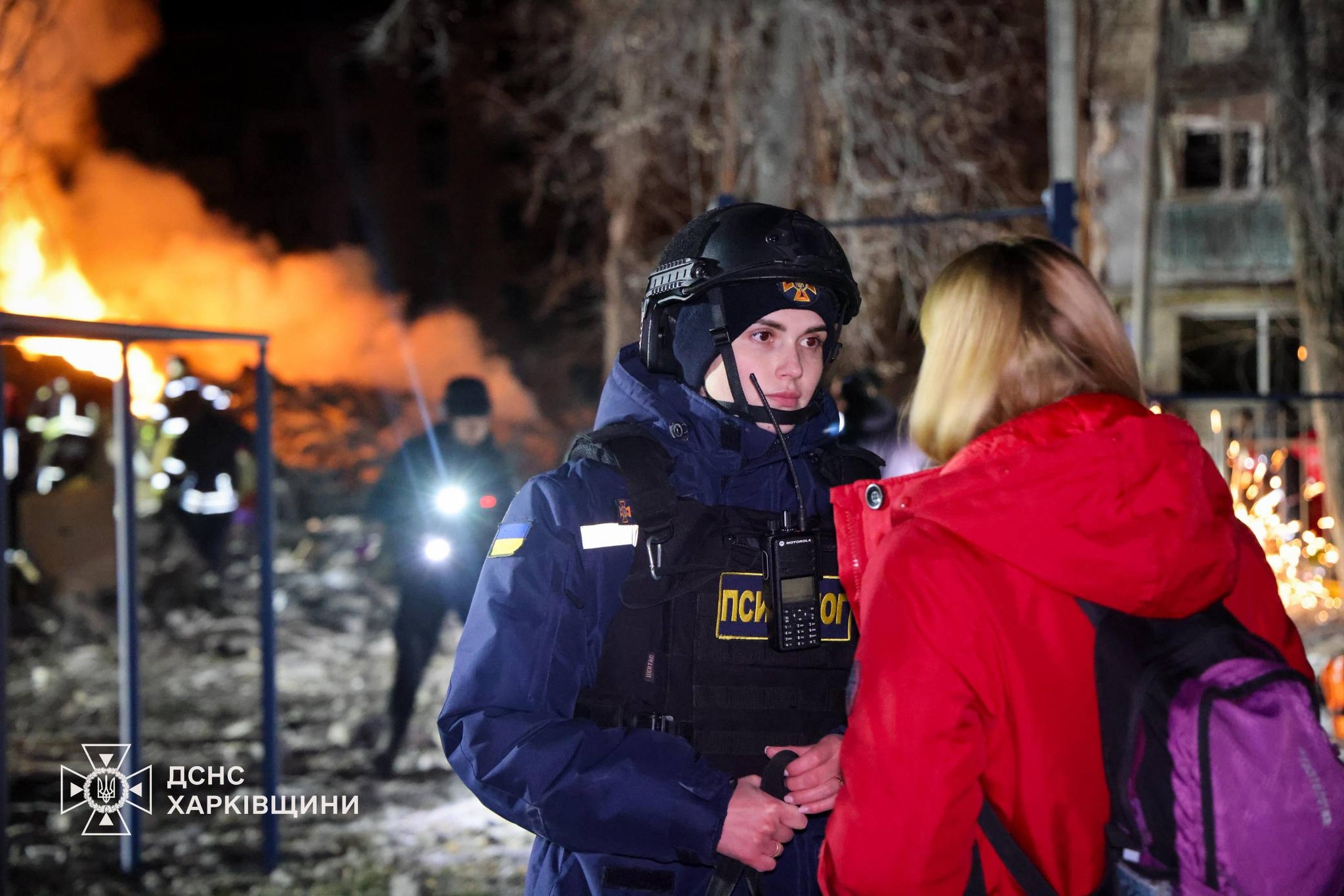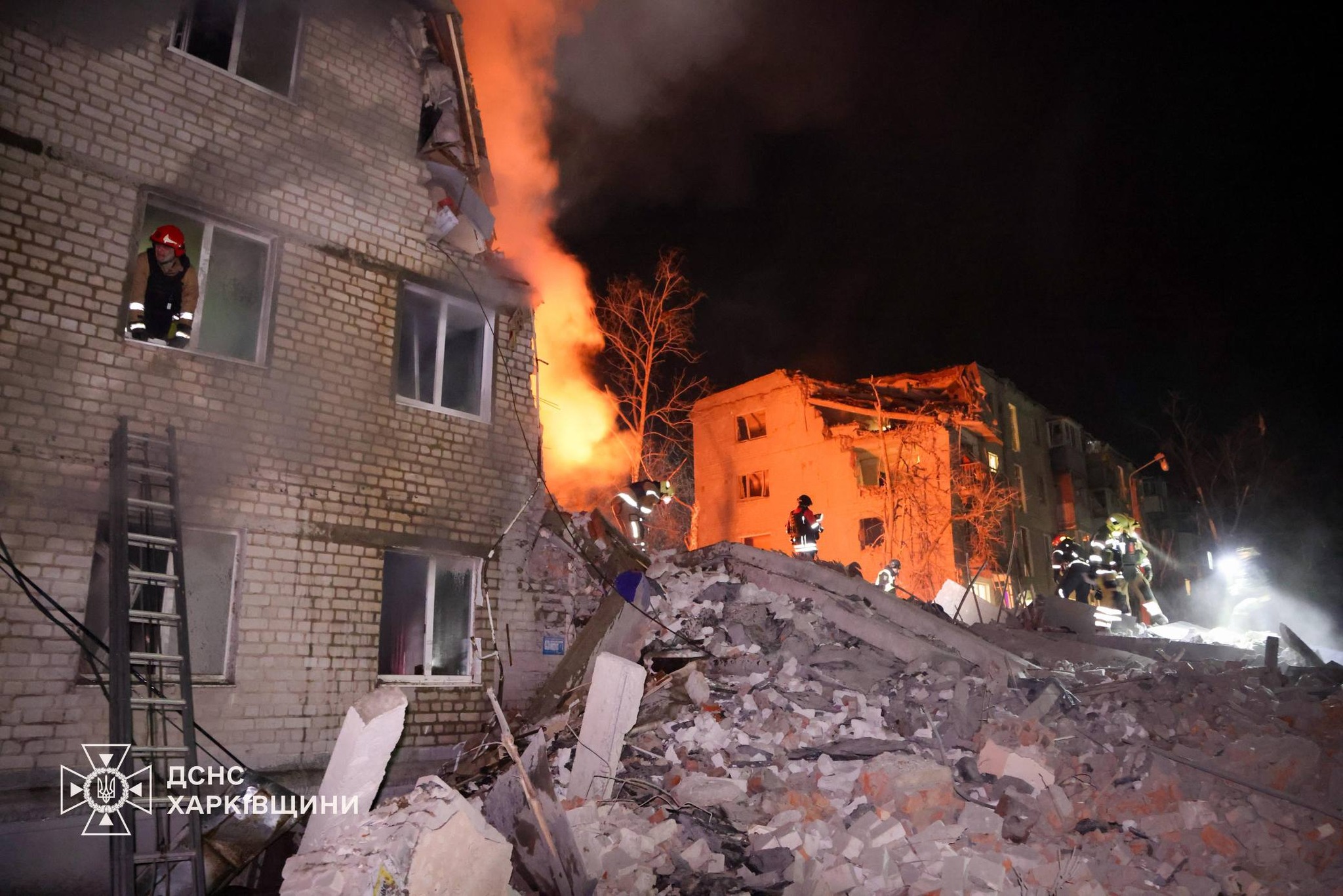 Доповнено о 04:13. “Сьогодні вночі ворог завдав ракетних ударів по Харкову. Одне з влучань сталося у житловий п’ятиповерховий будинок в Київському районі міста. Внаслідок обстрілу зруйновано під’їзд з першого по п’ятий поверхи, а також пошкоджено конструкції квартир четвертого та п’ятого поверхів сусідньої будівлі. Є загоряння конструктивних елементів. З-під завалів деблоковано тіло загиблої людини. Попередньо постраждало 10 осіб, серед них двоє дітей. Врятовано четверо людей. Під уламками ще можуть перебувати люди. Тривають роботи з ліквідації пожежі та пошуково-рятувальні заходи”, — повідомила пресслужба ГУ ДСНС України в Харківській області.