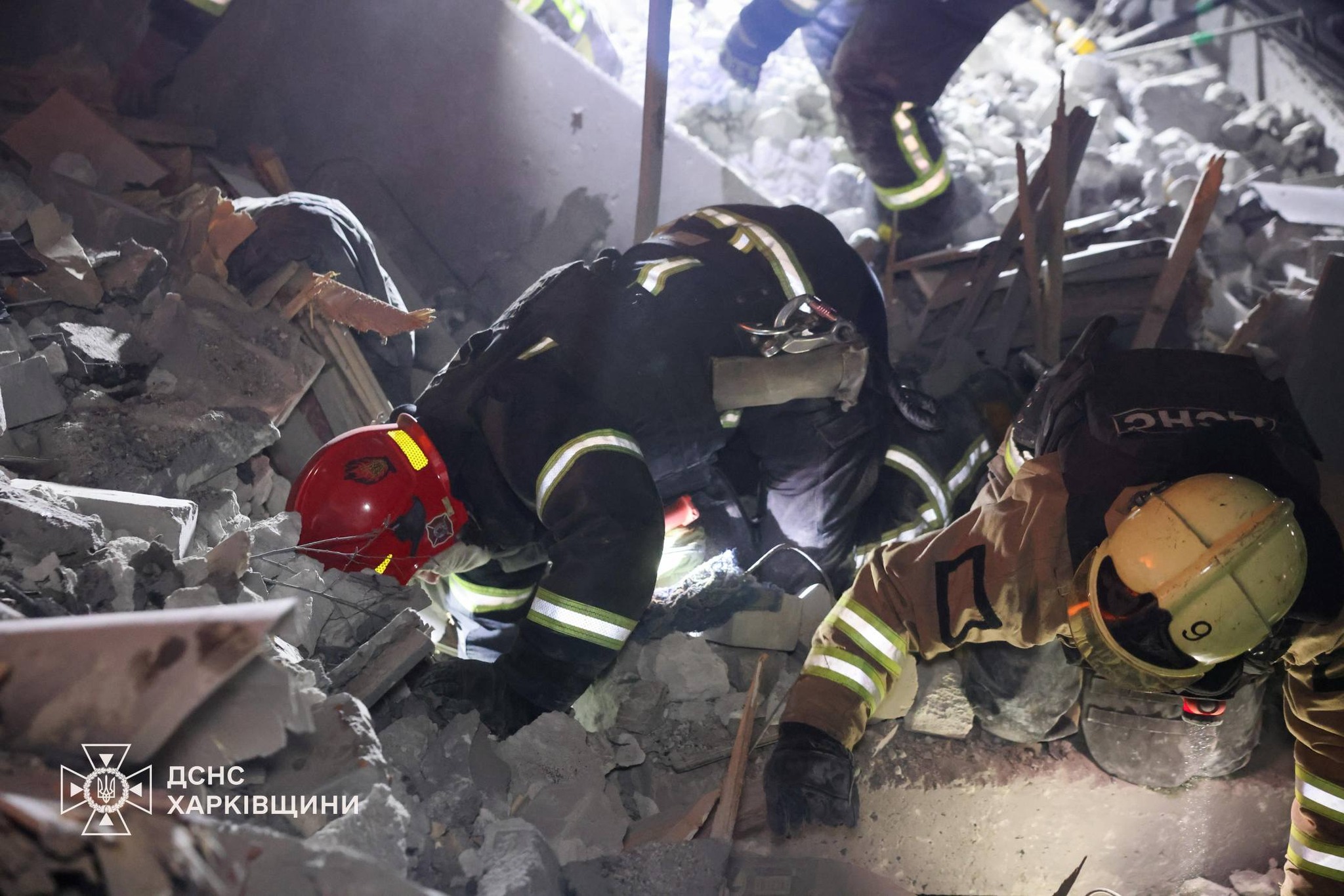Керівник Харківської ОВА Олег Синєгубов оприлюднив кадри з місця попадання по багатоповерховому будинку в Харкові. За останніми відомостями, під завалами може перебувати до десяти людей.