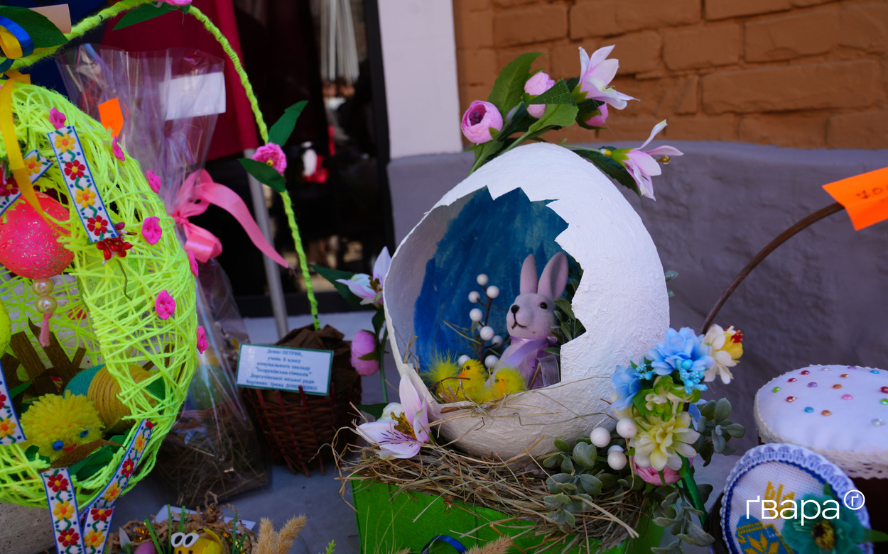 Євген, керівник відділу культури Дергачівської міської ради, розповів, що на ярмарок привезли вироби місцевих дітей, зокрема розмальовані використані боєприпаси.