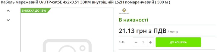 Мережевий кабель U/UTP кат. 5e 4×2х0,51 LSZ у кошторисі вказаний по 55,8 грн за погонний метр (ціна без ПДВ). Активісти знайшли аналогічний кабель з урахованим ПДВ приблизно по 21 грн за метр.