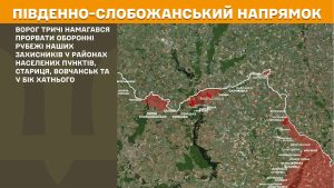 На Південно–Слобожанському напрямку російські формування тричі намагалися прорвати оборонні рубежі ЗСУ в районах населених пунктів Стариця, Вовчанськ та в напрямку Хатнього.